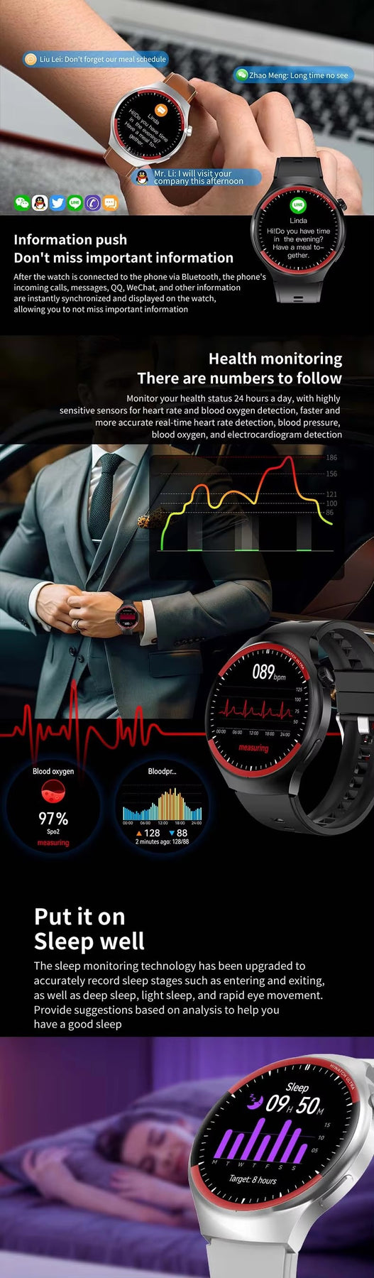 Restez connecté sans sortir votre téléphone. La technologie Bluetooth 5.0 assure une connexion stable pour recevoir vos notifications, messages et appels. Compatible avec Android 5.0+ et iOS 10.0+.